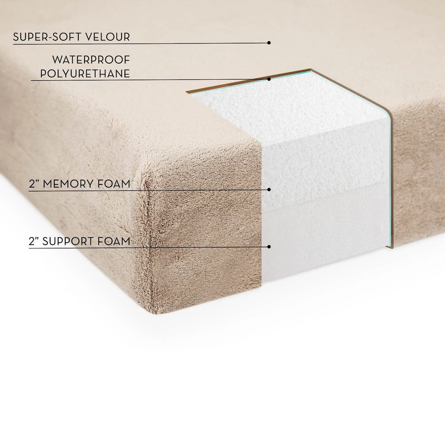 - The bottom layer features 2 inches of high-density support foam and the top layer features 2 inches of memory foam.