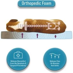- A 4-inch thick orthopedic insert evenly distributes your pup’s weight and provides paw-fect support for her head, neck, torso and joints.