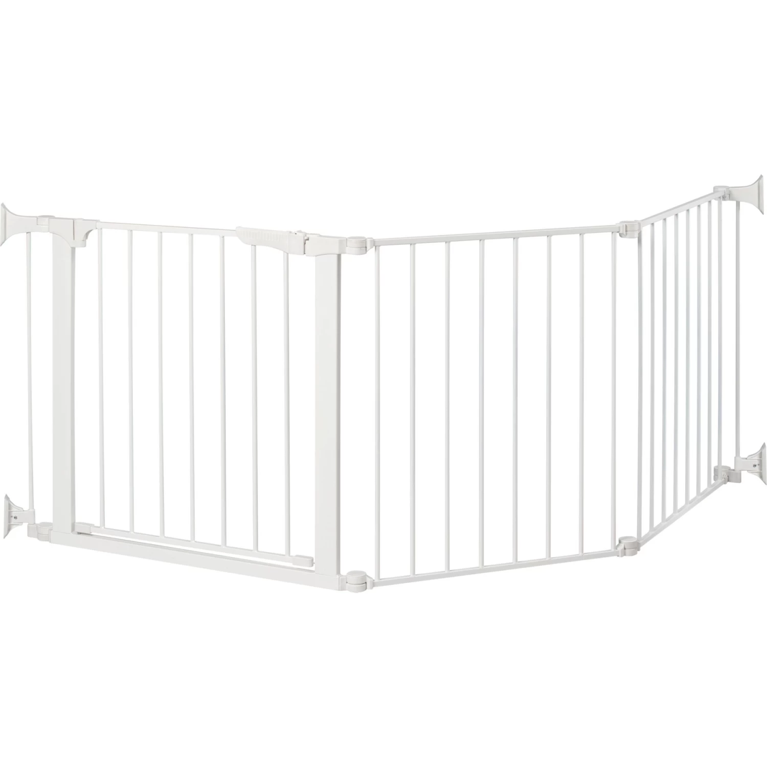 - Specially designed for extra-wide or oddly-shaped areas, this three-piece gate features rotating joints at each segment, so you can find your perfect angle and then secure it into place.