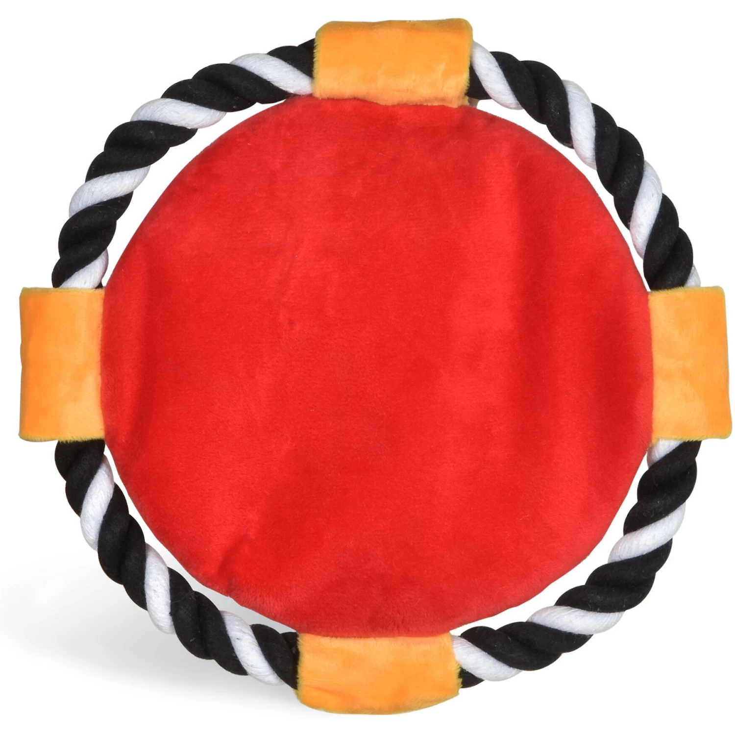 - This frisbee features a chewable rope edging and a soft plush center for multisensory fun.