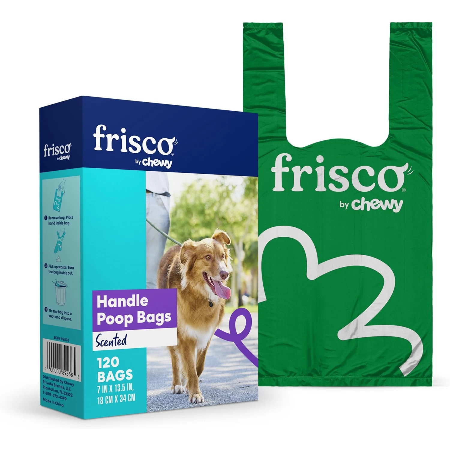 - From Frisco by Chewy. Poop bags with handles made of durable, leak-proof plastic, with dimensions of 13.5×7 inches, are the perfect size to clean up your pet’s mess with ease.