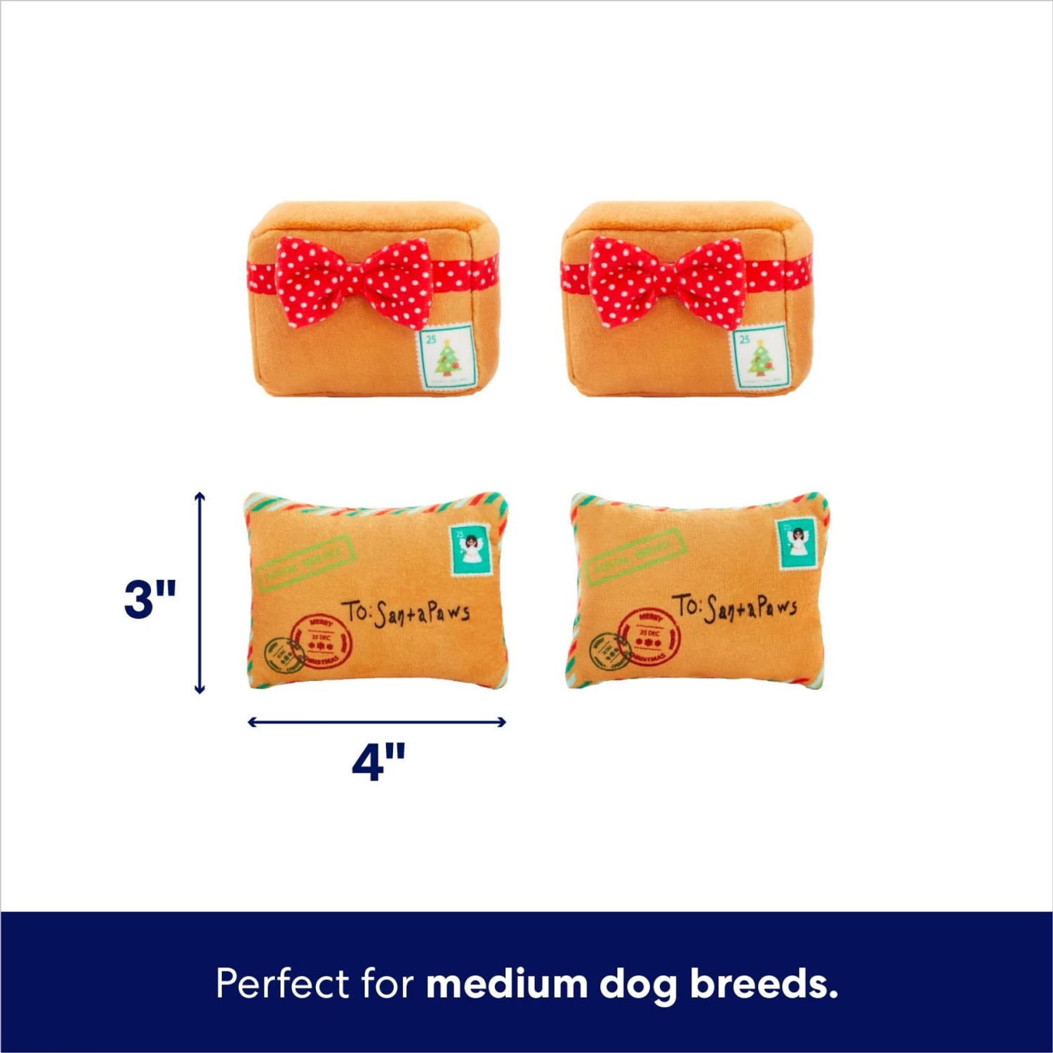 - Holiday puzzle toy comes with a mailbox base along with four package and letter plush toys.