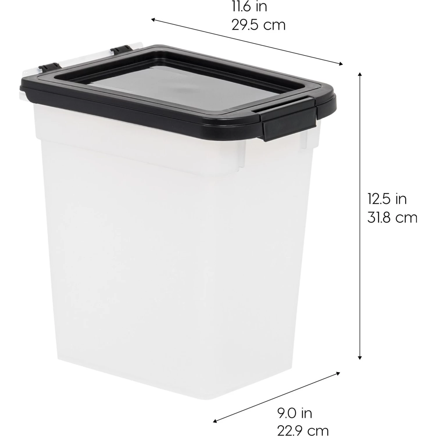 - Designed with a wide top and secure latch for easy opening, scooping and cleaning.