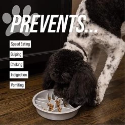 - Promotes slower eating and works great with dry, wet and raw food.