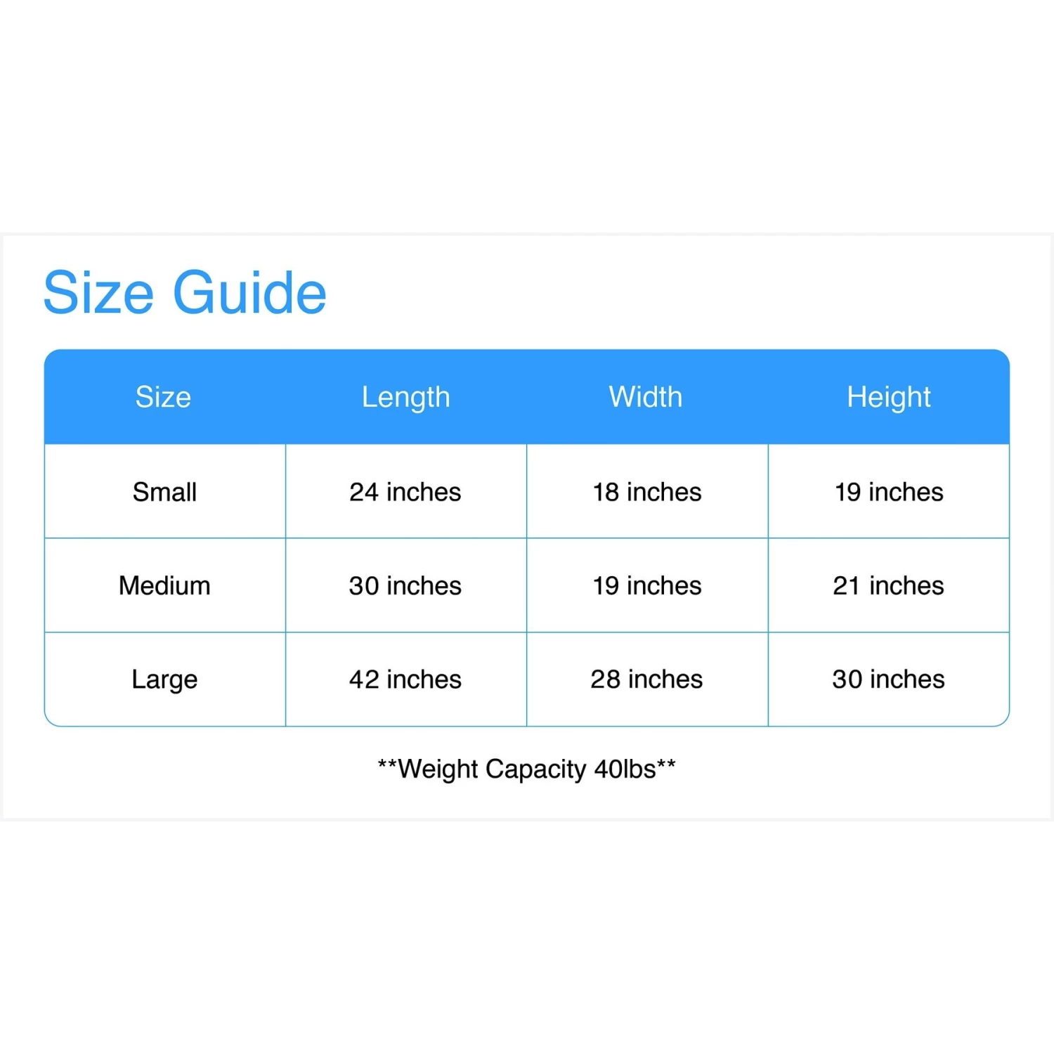 | Size | S: 24-in L x 18-in W x 19-in H, L: 42-in L x 28-in W x 30-in H, Med: 30-in L x 19-in W x 21-in H |