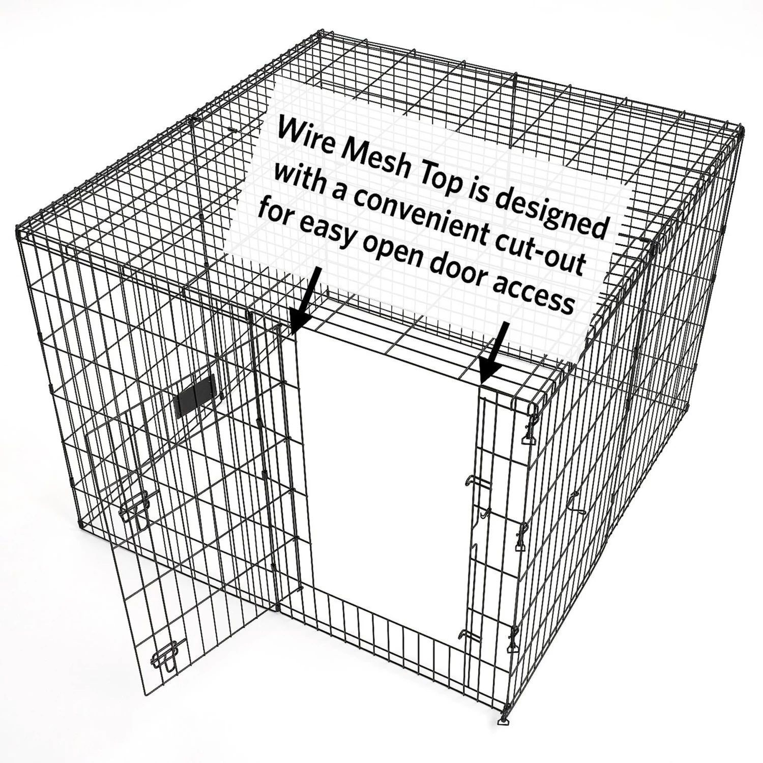 - Metal top is easy to install with no tools required and is hinged down the center for easy half-access into the dog pen.