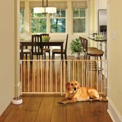 - Wooden gate adjusts to fit openings from 60 to 103 inches wide and is 27 inches high.