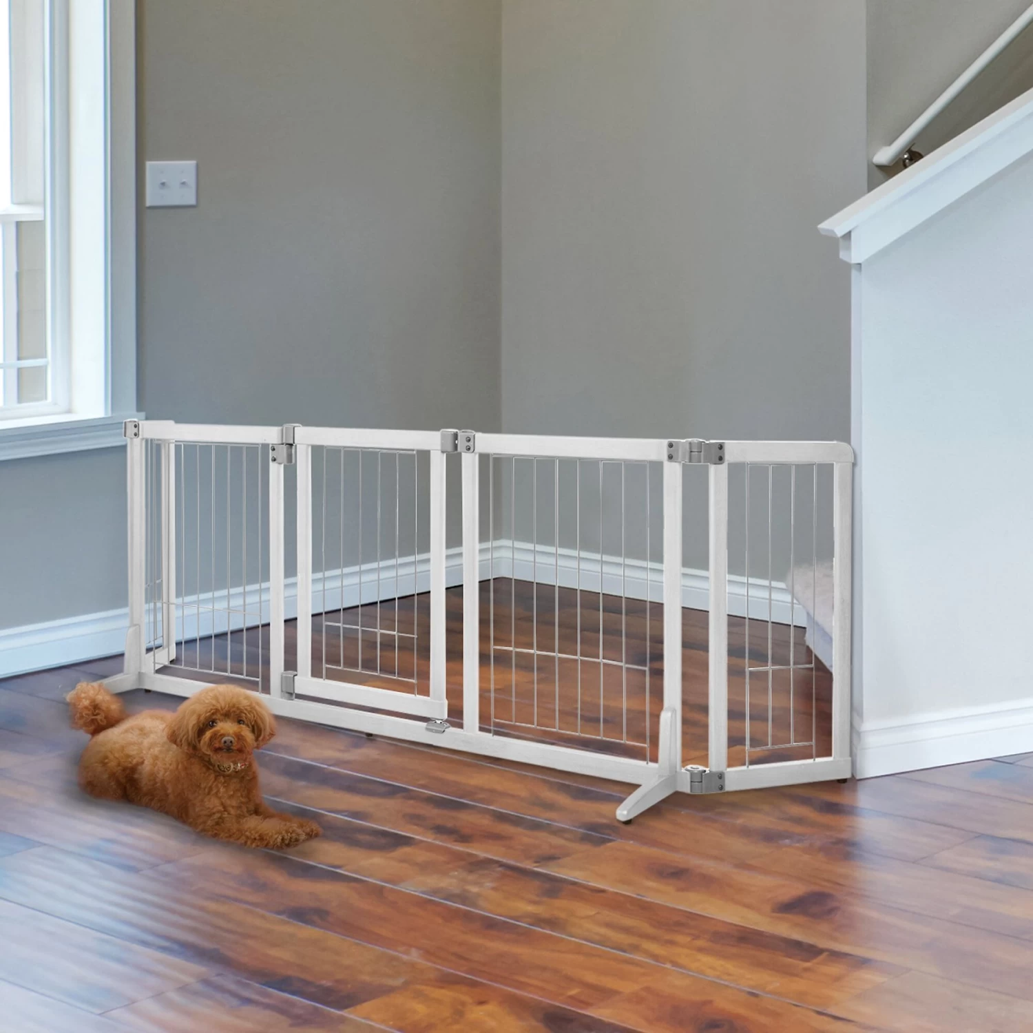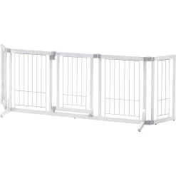 - Recommended for small dogs 6.6 to 17.6 lbs., this gate has 1 ¾” space between wire slats and a 16” wide door opening.