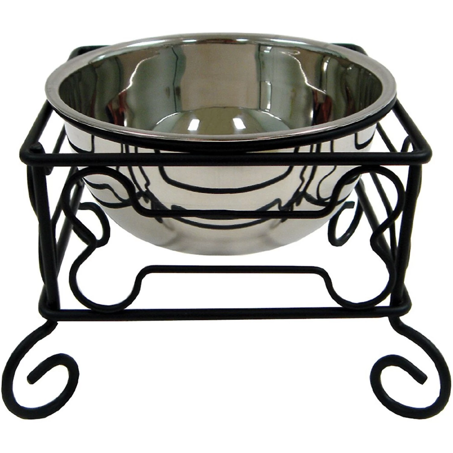- Elegant elevated feeder features a wrought-iron stand with a cute bone design and scrolled legs.